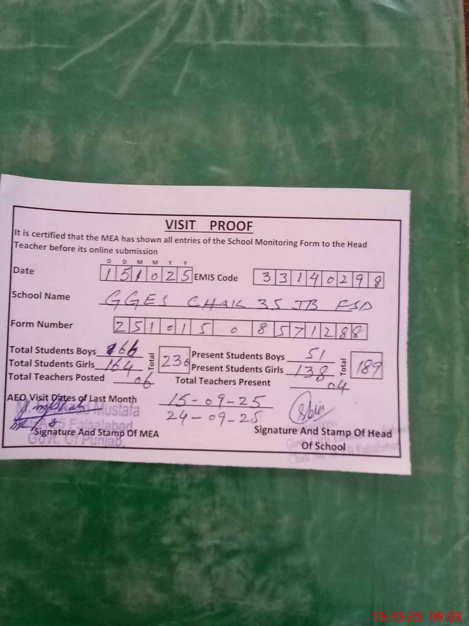 | EMIS Code: 33140298 | Name of School: GGES CHAK NO 35 JB | |||
