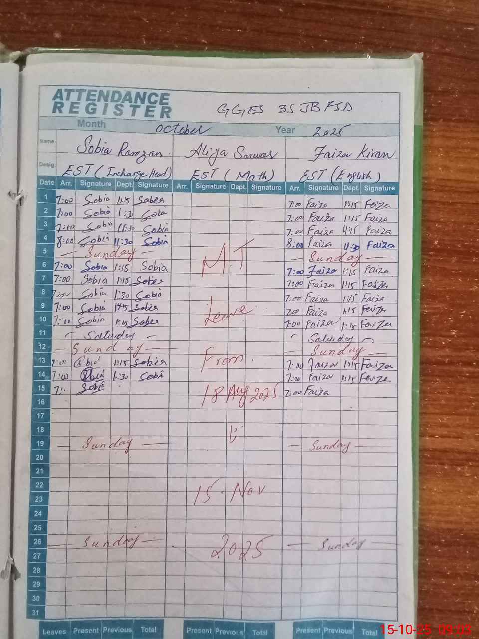Leave Type | Remarks for today (Leave,Training, Exam,Absent,Late, Other duty) |