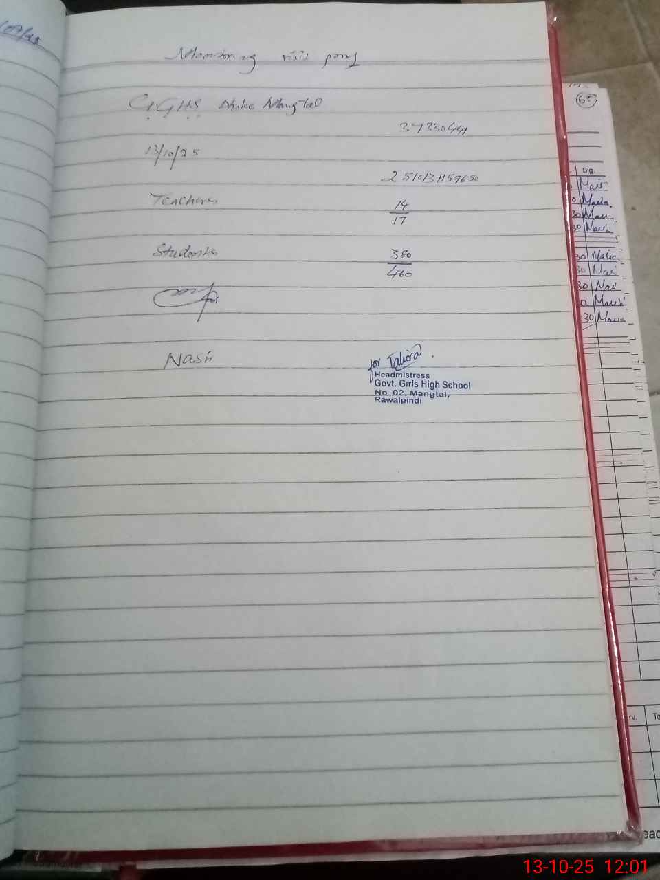 | Attendance Register | Head Teacher | MEA with School | Visit Proof |