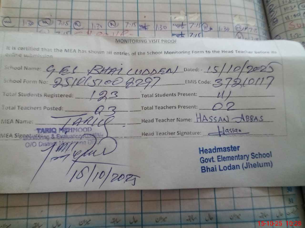 | Attendance Register | Head Teacher | MEA with School | Visit Proof |