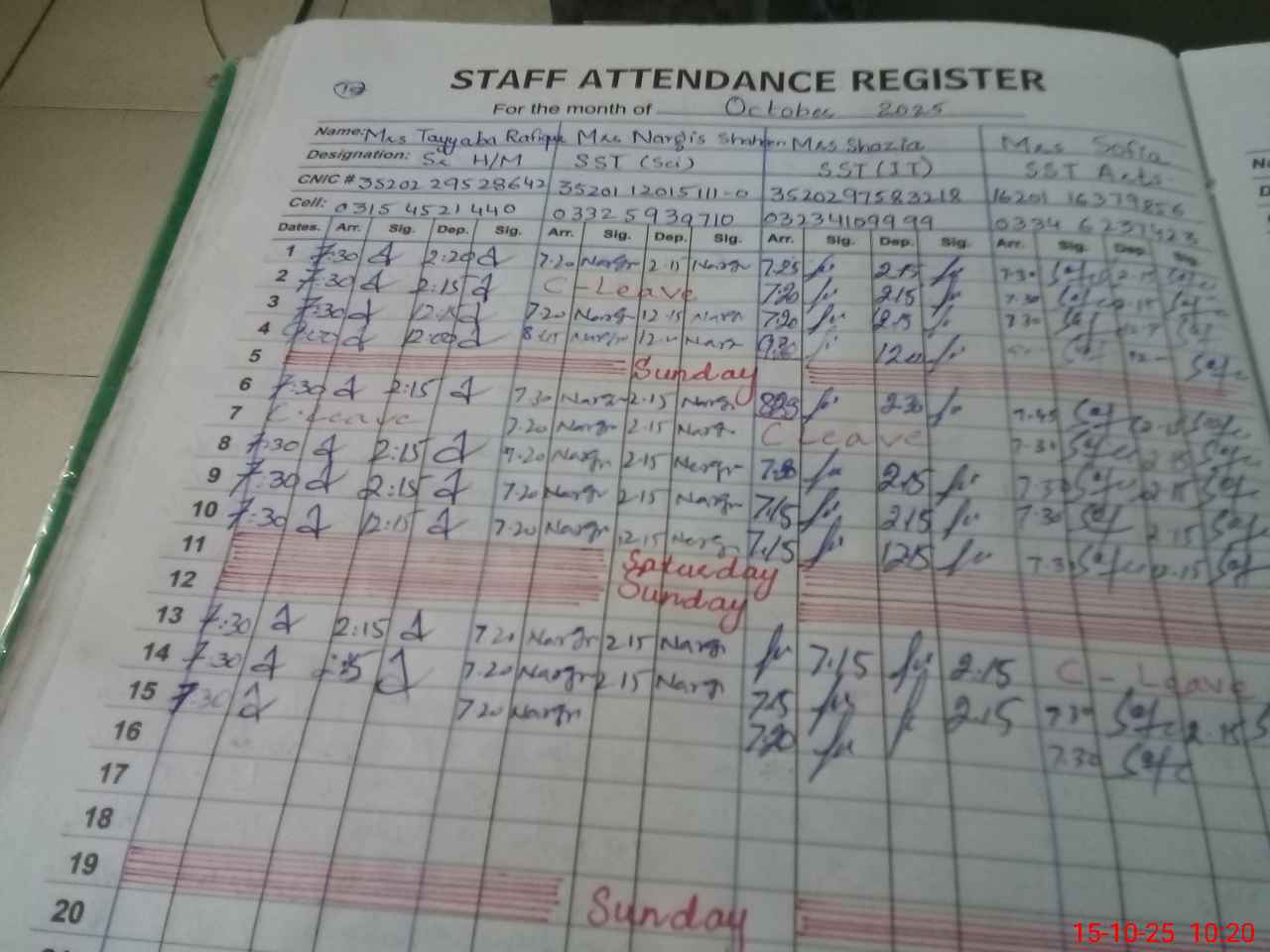 | CNIC | Full Name | Designation | R/C | Absence during last cal. month |