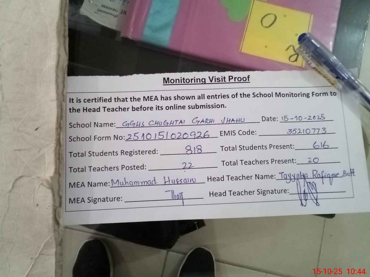 | Attendance Register | Head Teacher | MEA with School | Visit Proof |