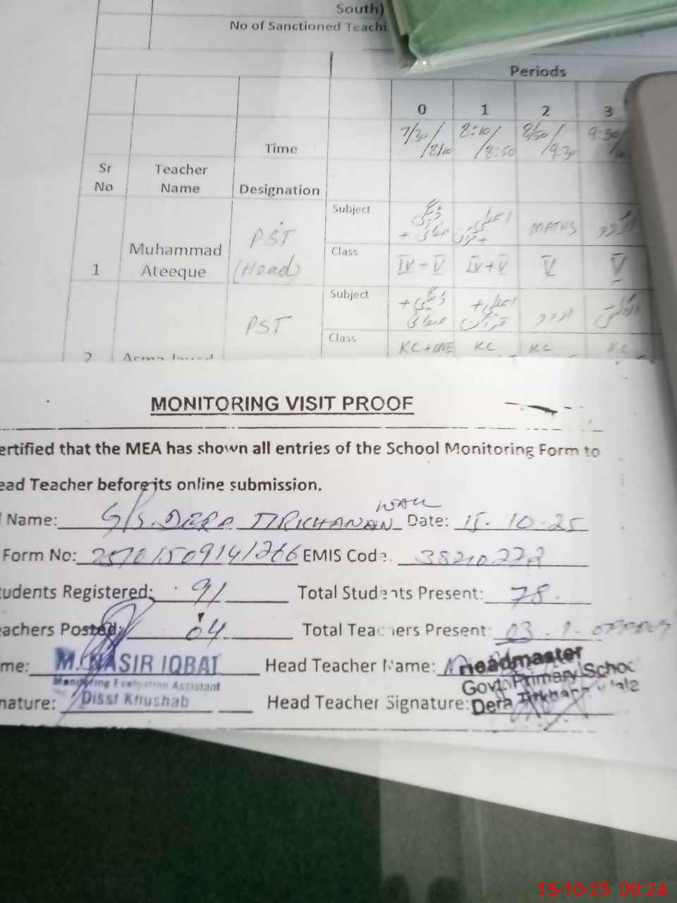 | Attendance Register | Head Teacher | MEA with School | Visit Proof |