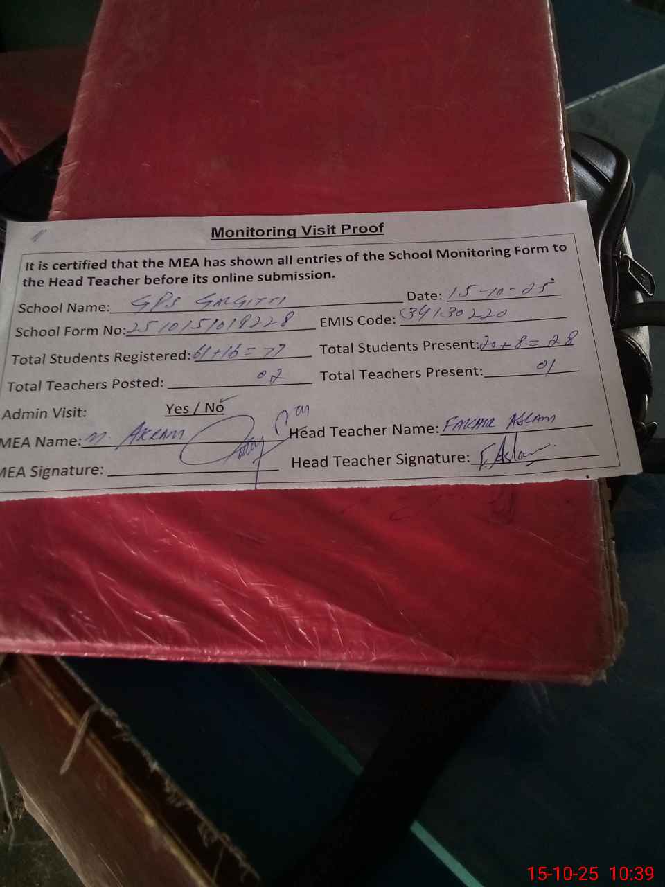 | Attendance Register | Head Teacher | MEA with School | Visit Proof |