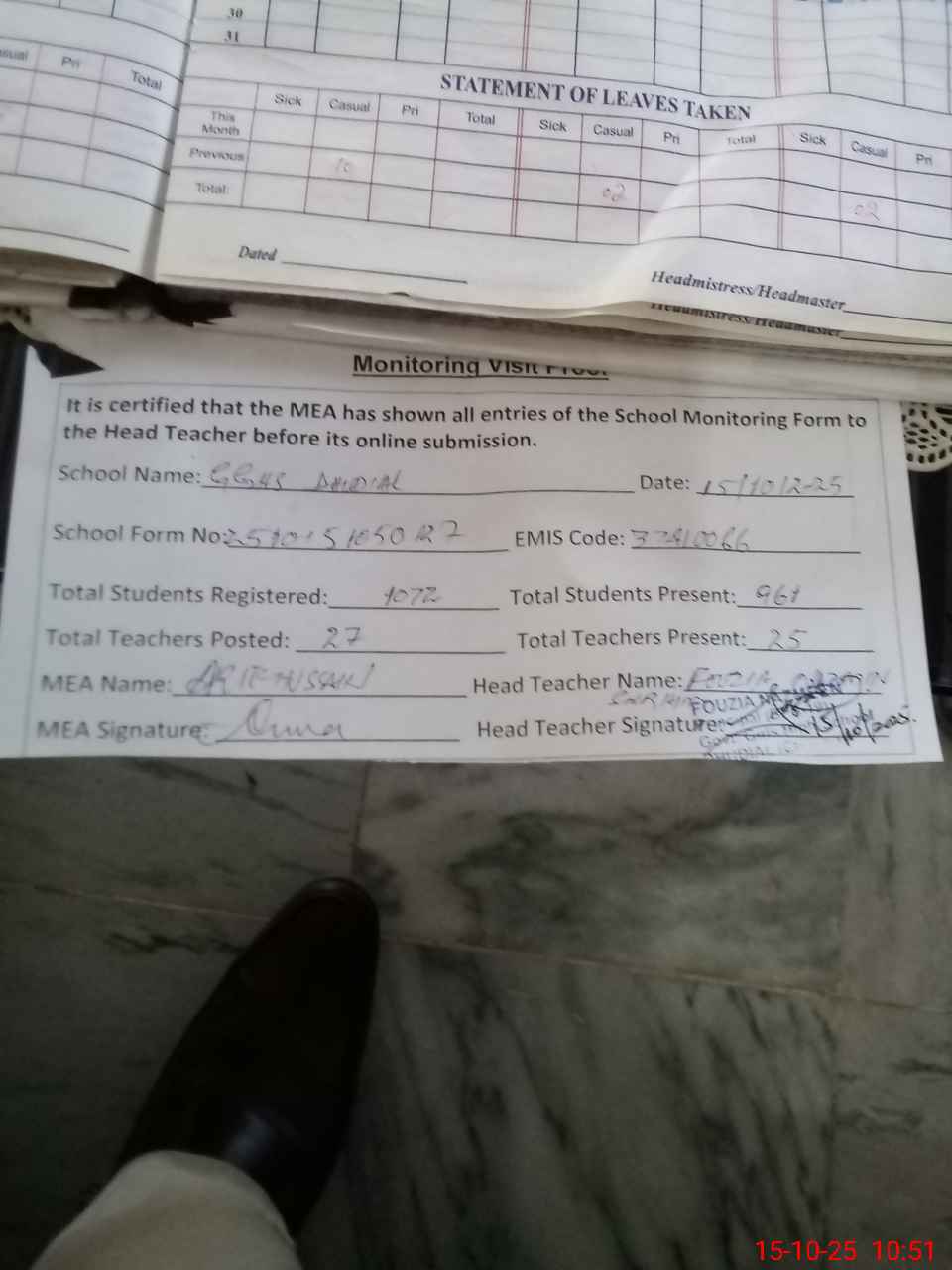 | Attendance Register | Head Teacher | MEA with School | Visit Proof |