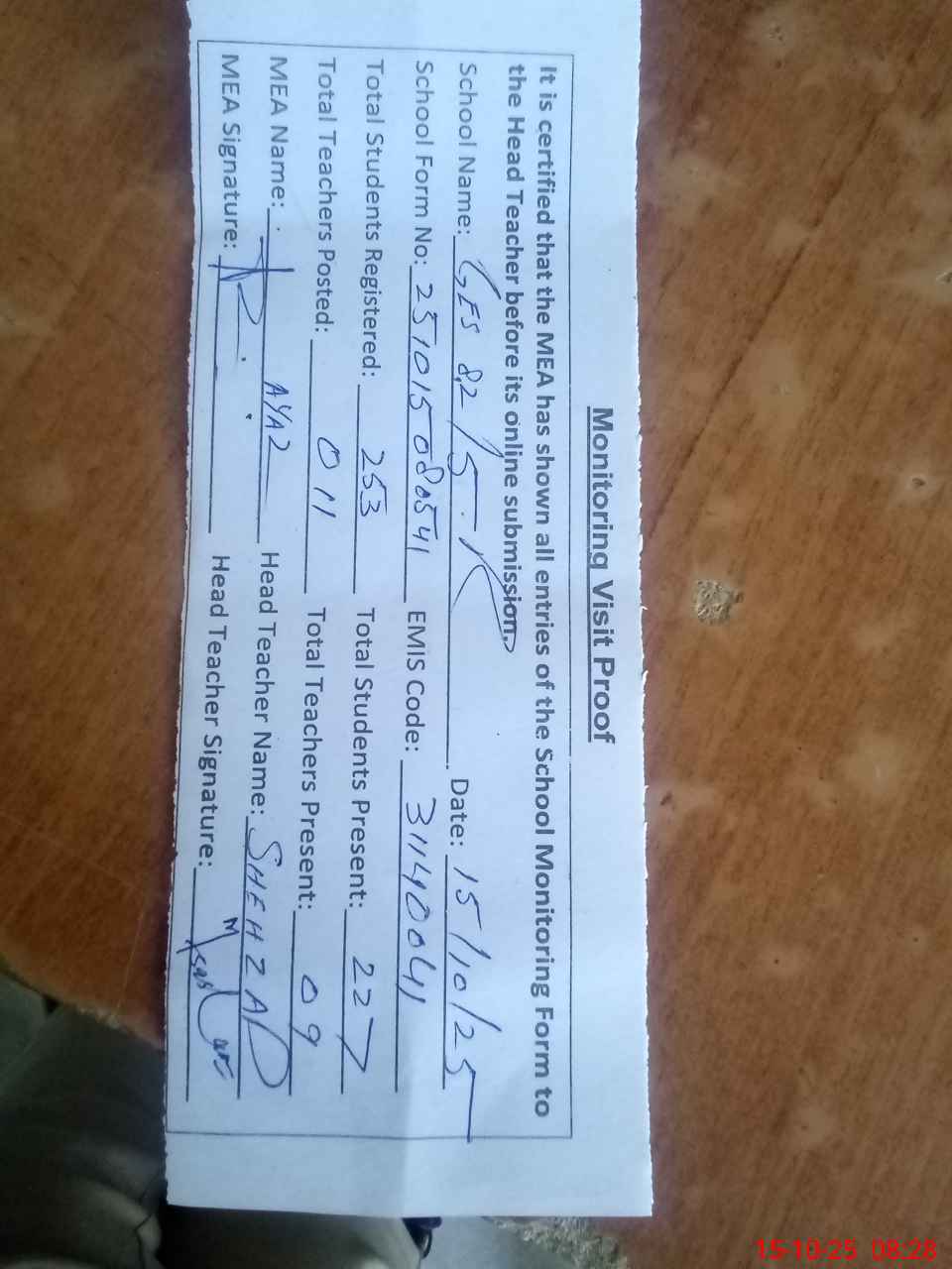 | Attendance Register | Head Teacher | MEA with School | Visit Proof |