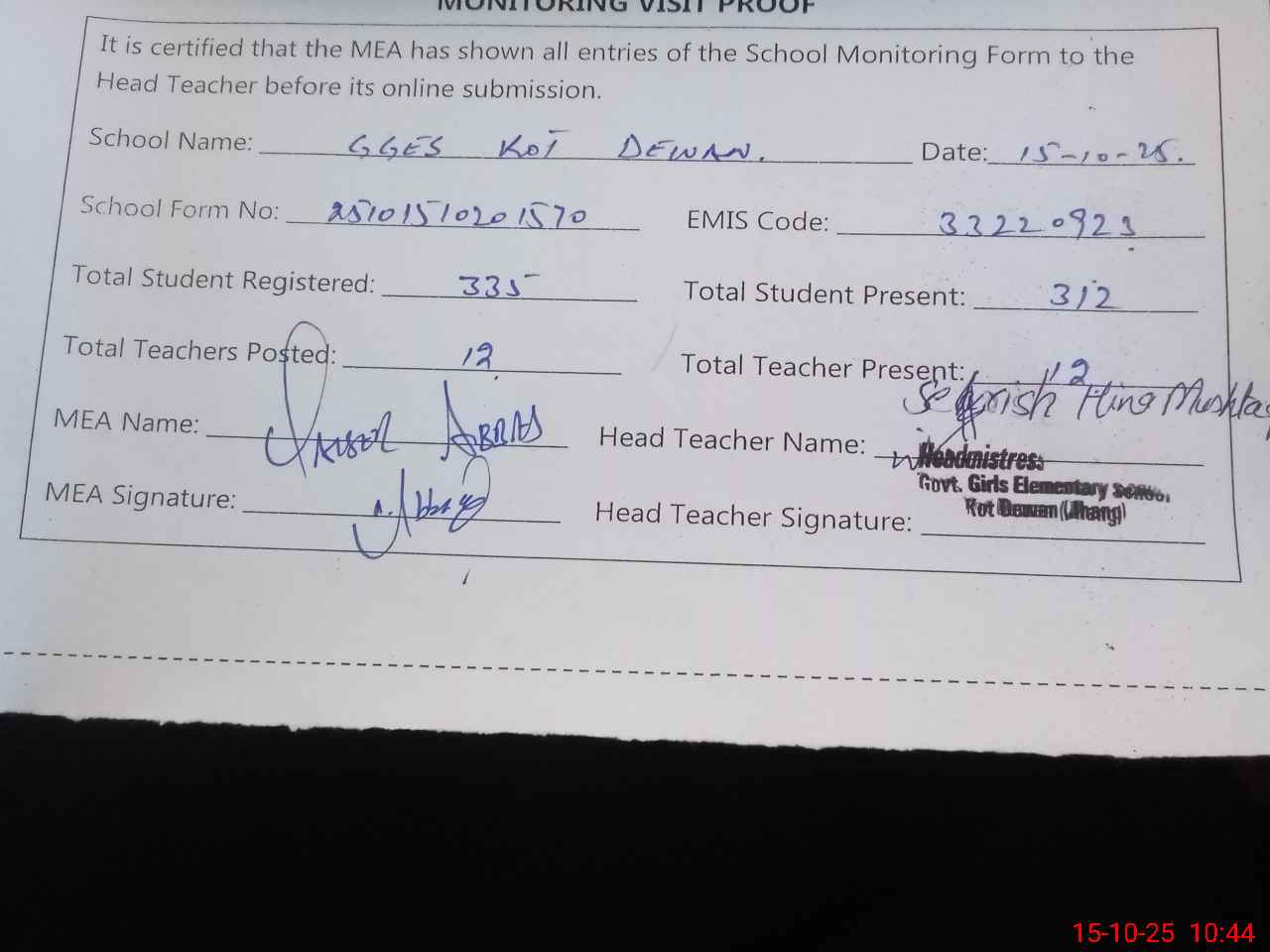| Attendance Register | Head Teacher | MEA with School | Visit Proof |