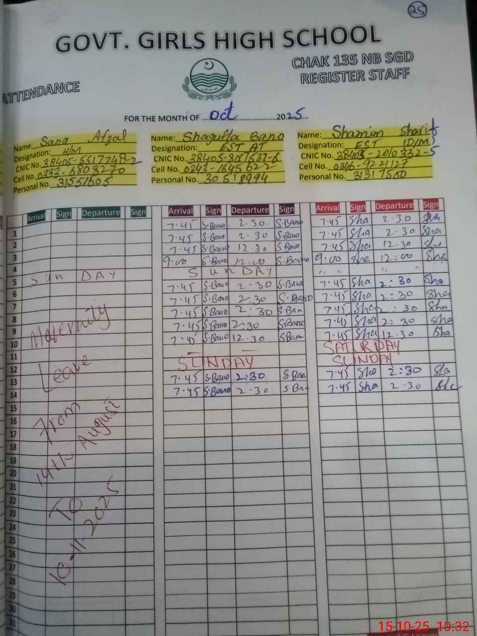 | Name: Sa**** Af**** Designation: (School Headmaster's/Headmistress's) SST (SCI) Phone/Cell Number: 03**** |