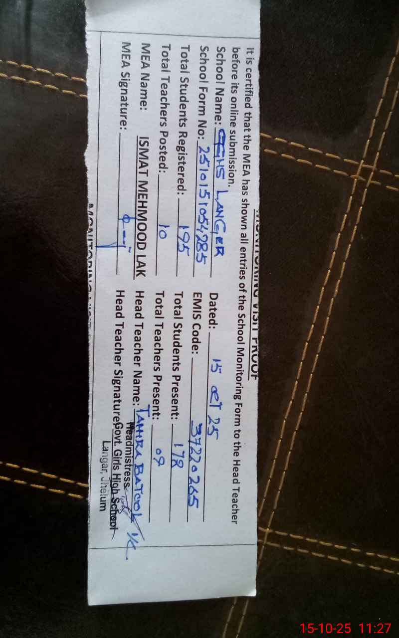 | Attendance Register | Head Teacher | MEA with School | Visit Proof |