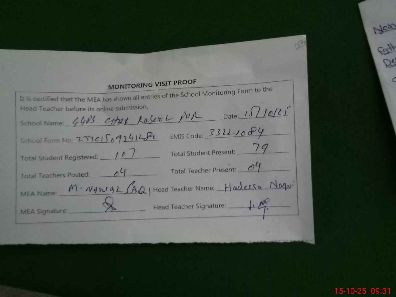 | Attendance Register | Head Teacher | MEA with School | Visit Proof |