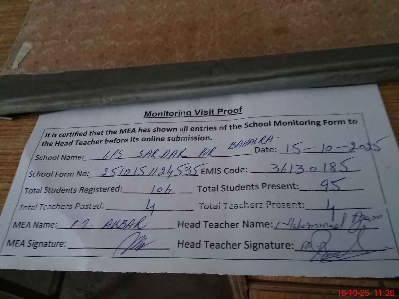 | Monitoring Date: 15-10-2025 | Start Time: 15-10-2025 11:01 AM | End Time: 15-10-2025 11:28 AM | Name of MEA: MU**** AK**** KH**** | |