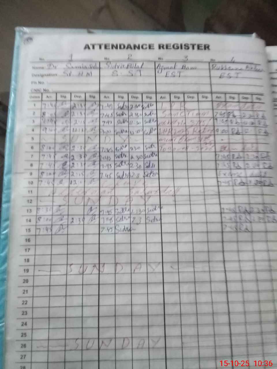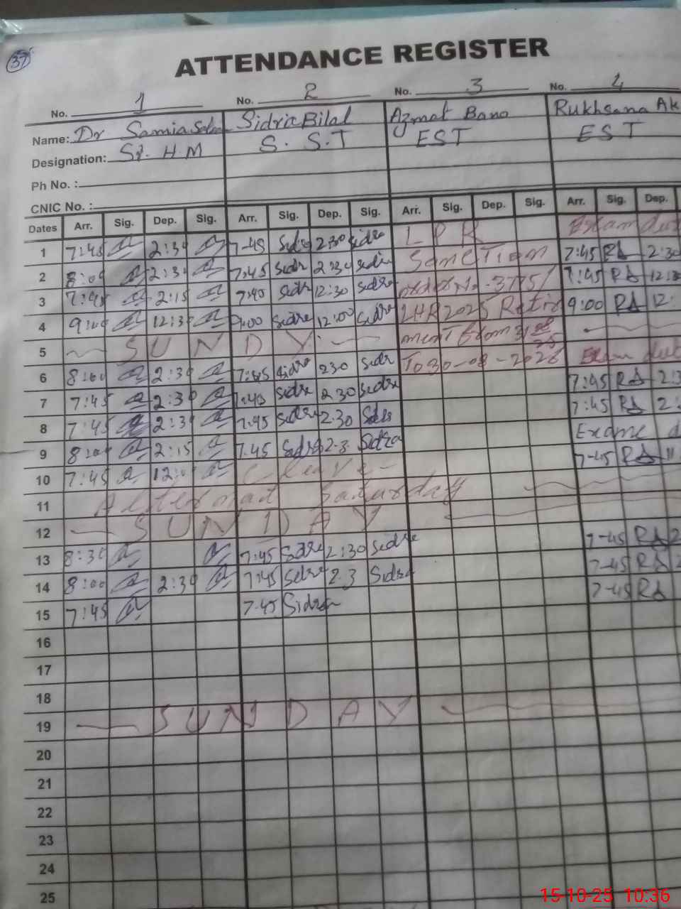 | CNIC | Full Name | Designation | R/C | Absence During Last Calender Month |