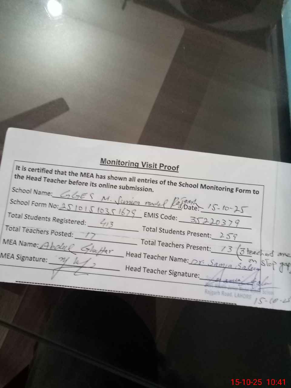 | Certified that this School was Inspected by the Undersigned MEA/DMO Today and the Information Stated Above is as Per Record. | |||||