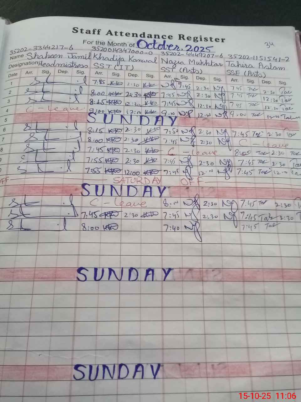 | CNIC | Full Name | Designation | R/C | Absence during last cal. month |