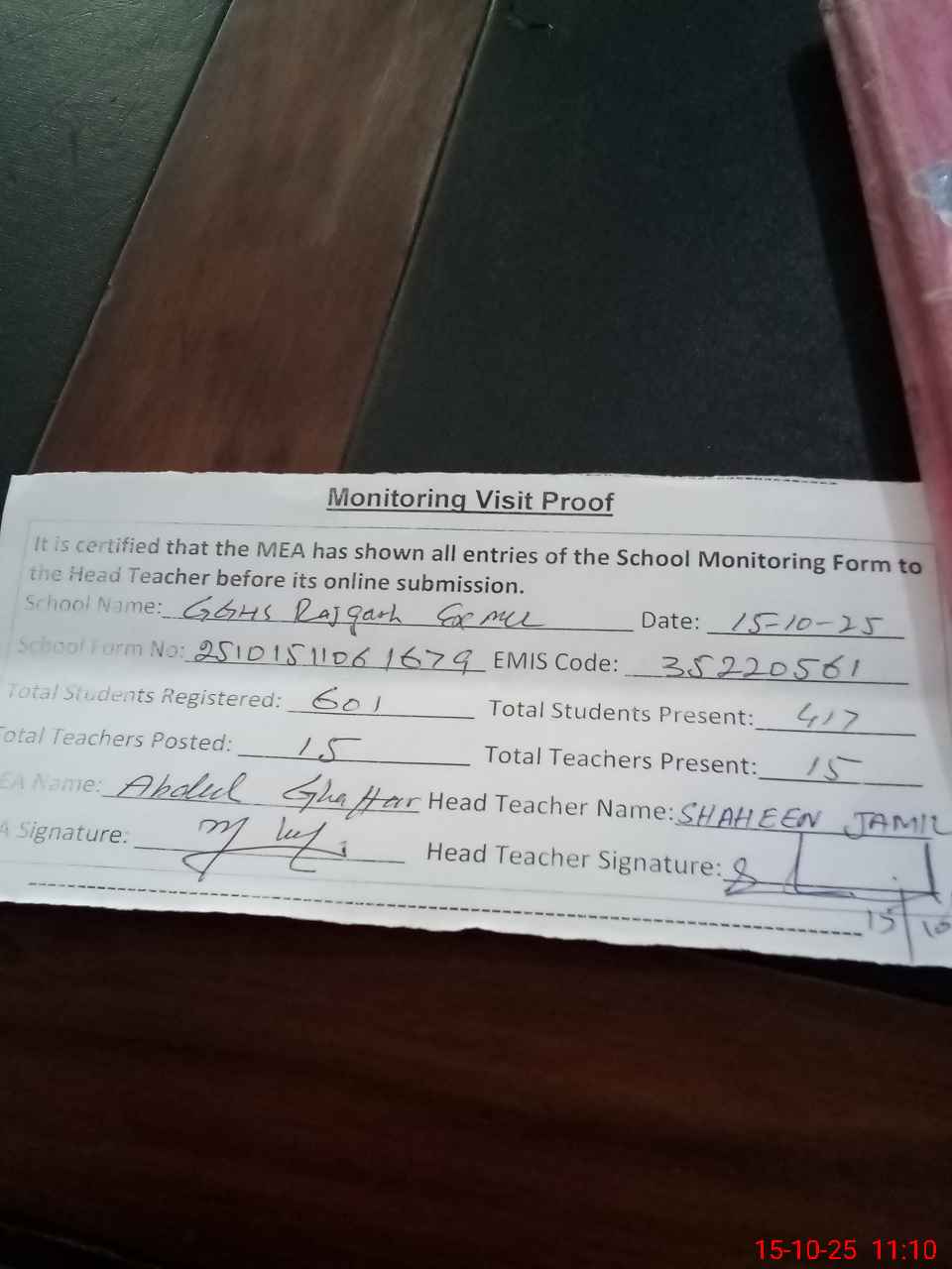 | Attendance Register | Head Teacher | MEA with School | Visit Proof |