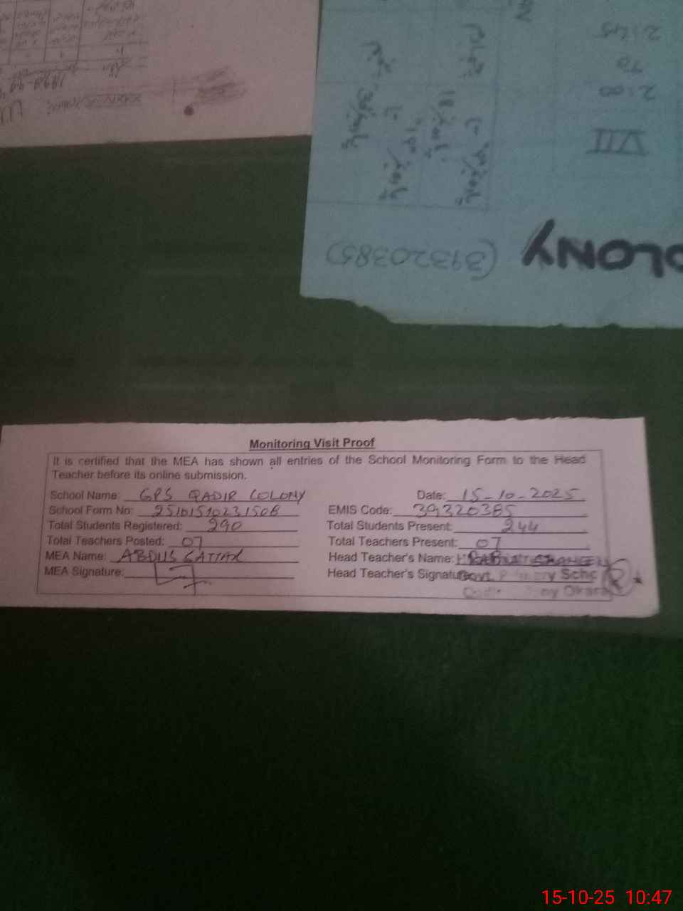 | Certified that this School was Inspected by the Undersigned MEA/DMO Today and the Information Stated Above is as Per Record. | |||||