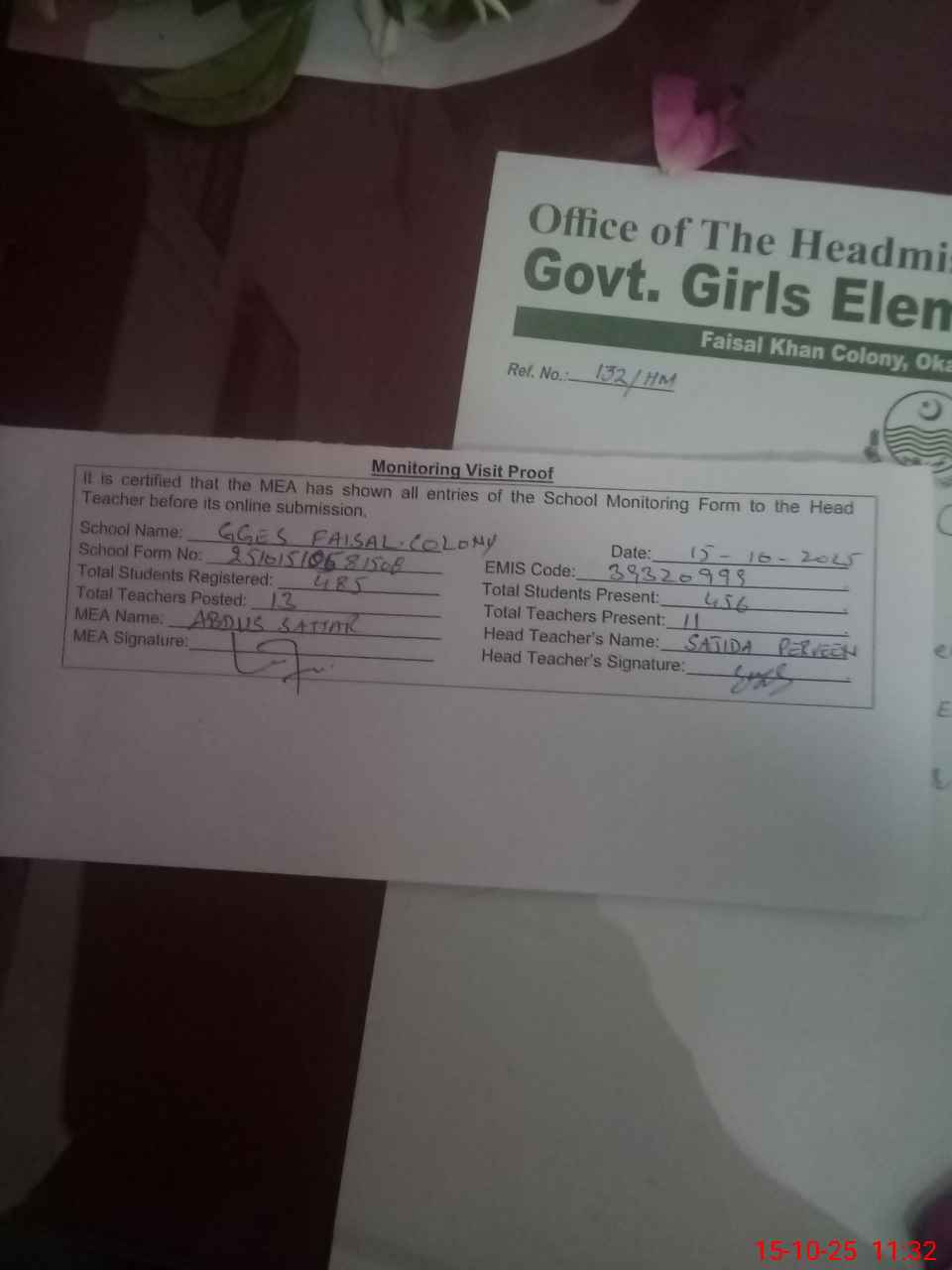 | Attendance Register | Head Teacher | MEA with School | Visit Proof |