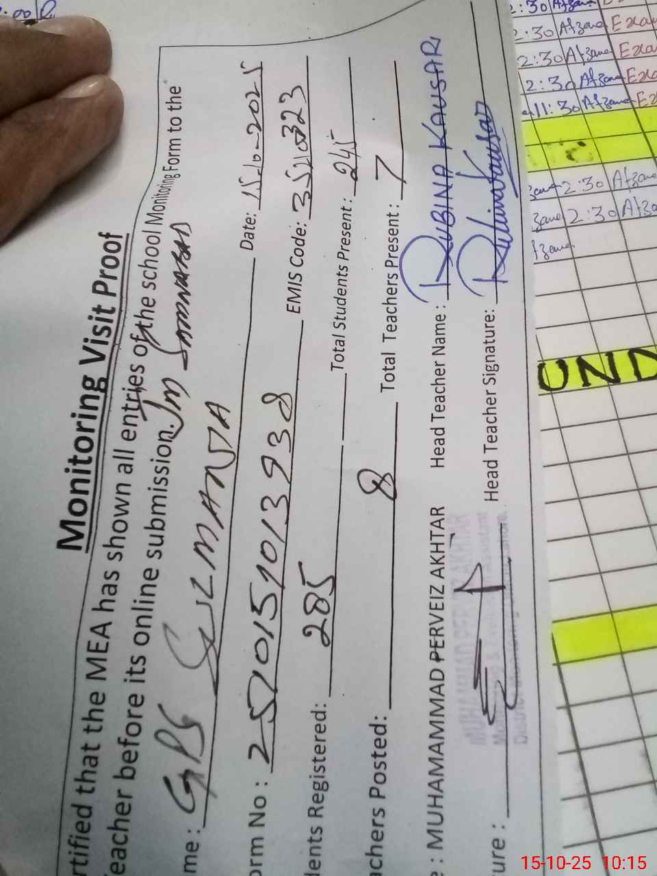 | Monitoring Date: 15-10-2025 | Start Time: 15-10-2025 09:40 AM | End Time: 15-10-2025 10:15 AM | Name of MEA: M.**** AK**** | |