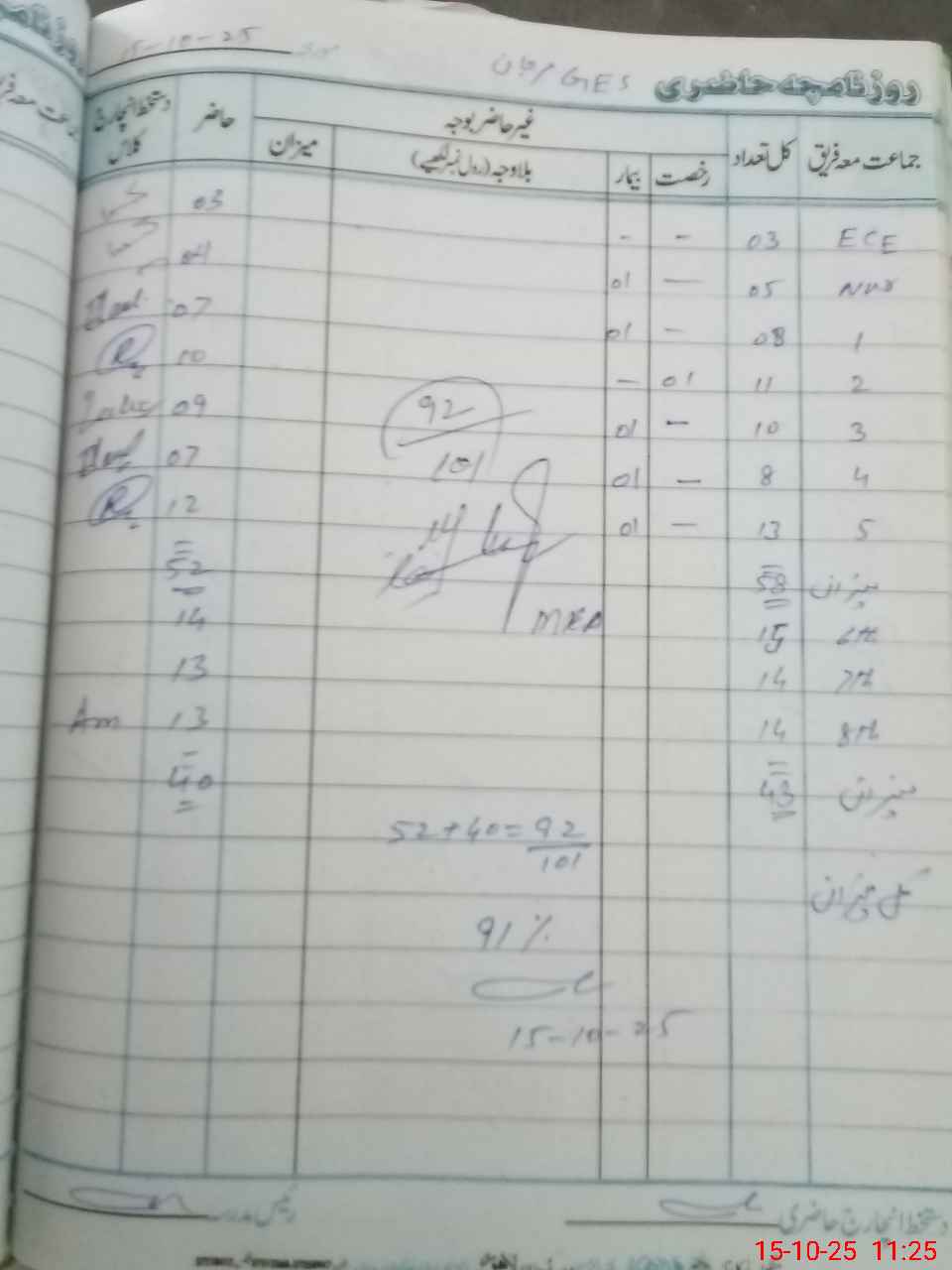 | No. of Students Present - Male | 3 | 0 | 4 | 7 | 10 | 9 | 7 | 12 | 14 | 13 | 13 | 92 | ||||