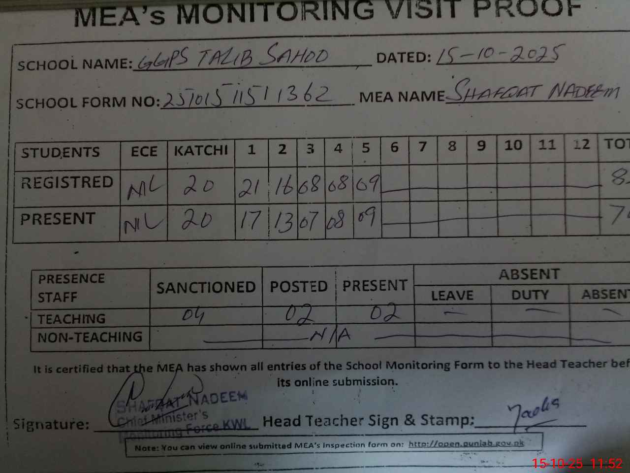 | Attendance Register | Head Teacher | MEA with School | Visit Proof |