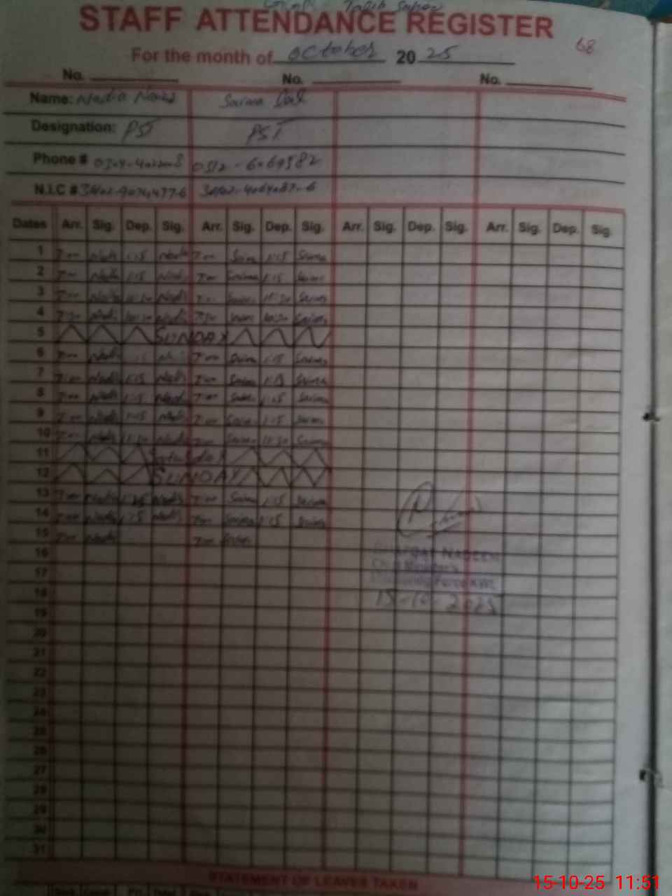| CNIC | Full Name | Designation | R/C | Absence During Last Calender Month |