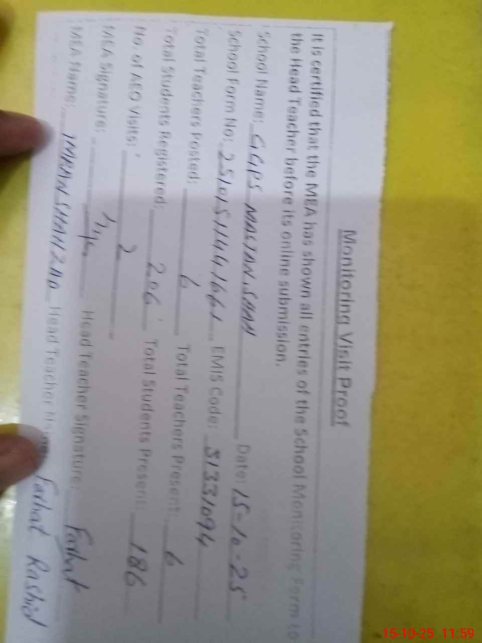 | Attendance Register | Head Teacher | MEA with School | Visit Proof |