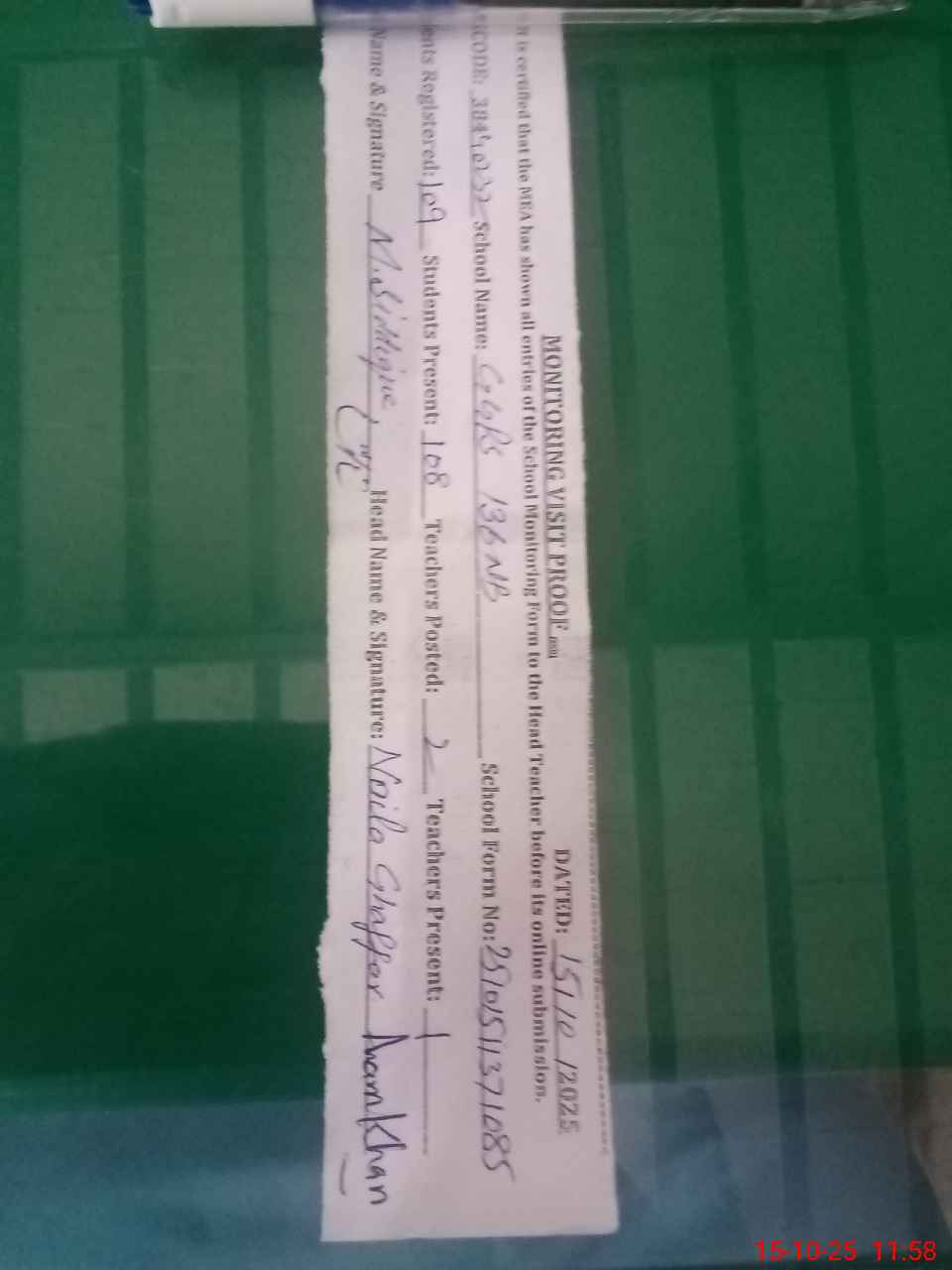 | Attendance Register | Head Teacher | MEA with School | Visit Proof |