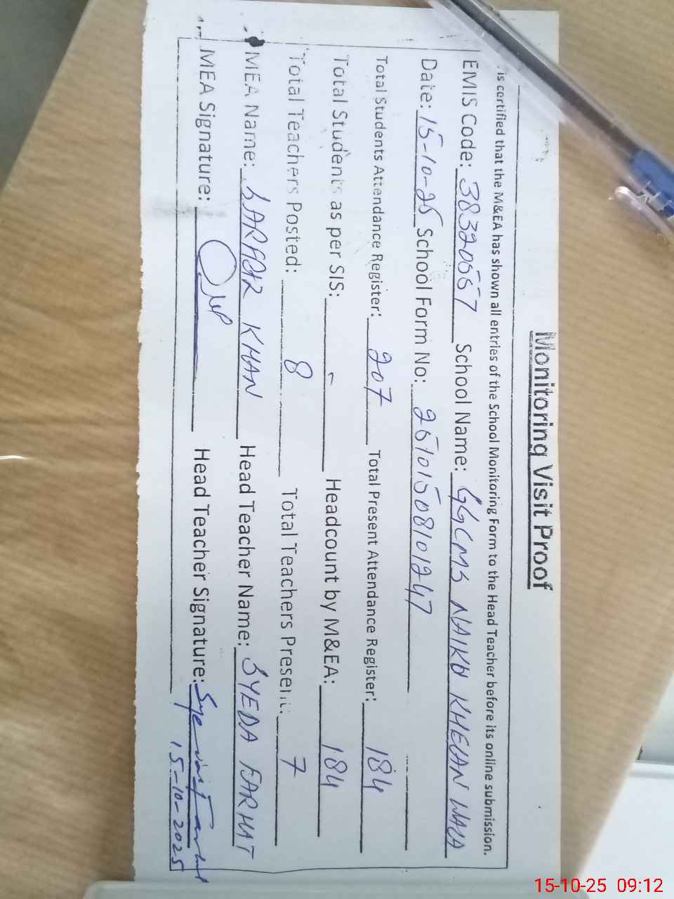 | Attendance Register | Head Teacher | MEA with School | Visit Proof |