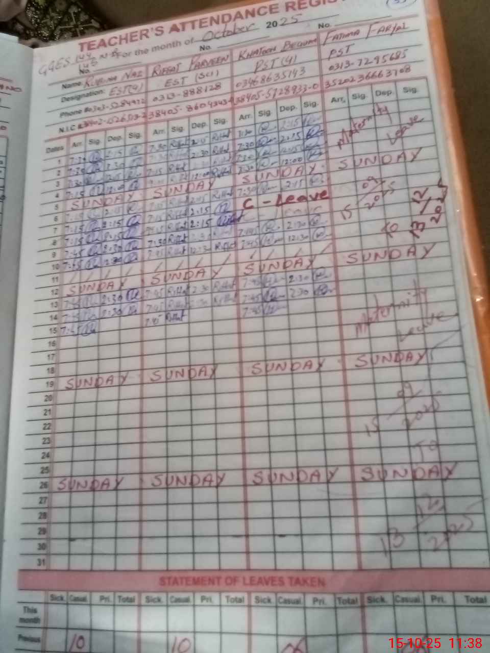 | Leave | Duty | Absent | Maternity | Medical | Ex- Pak |