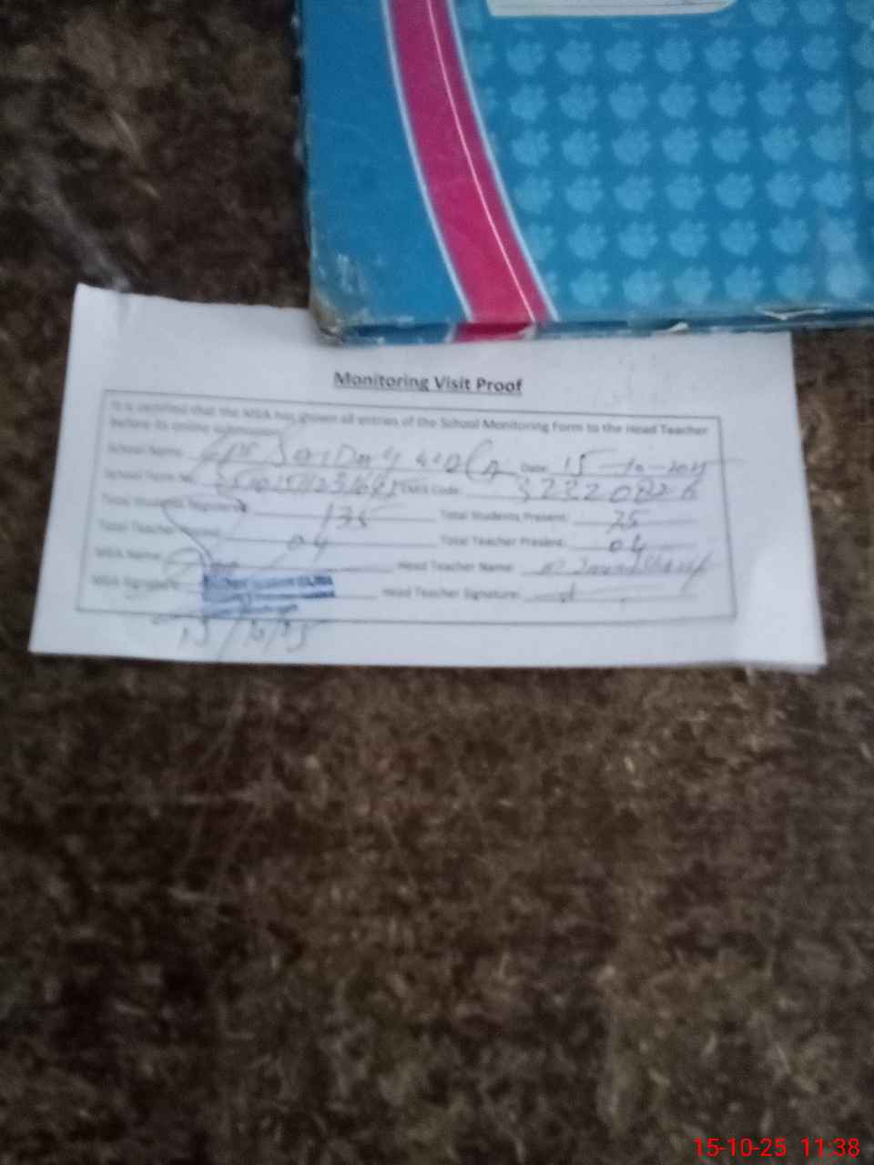 | Attendance Register | Head Teacher | MEA with School | Visit Proof |