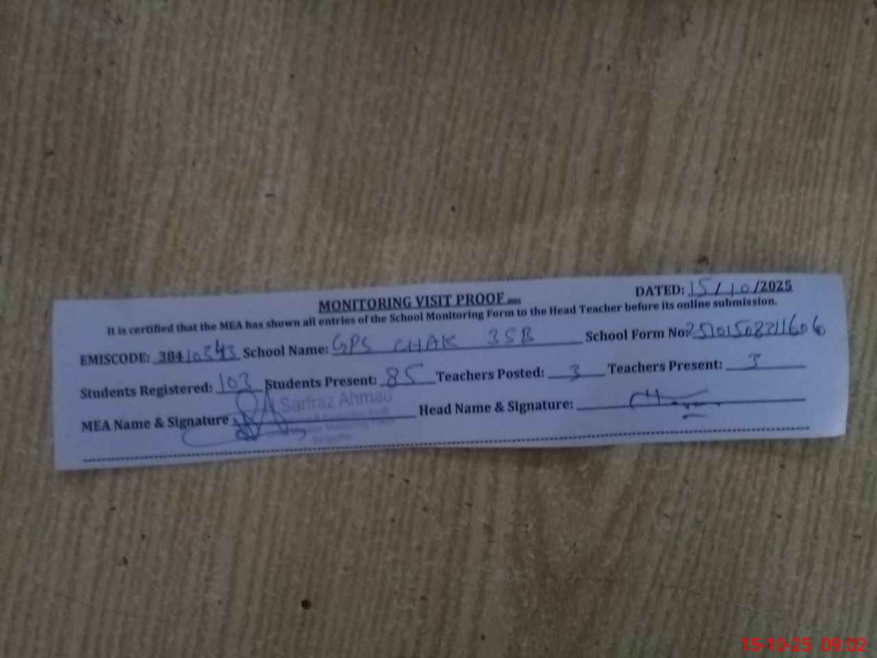 | EMIS Code: 38410343 | Name of School: GPS CHAK NO.3 SB | |||