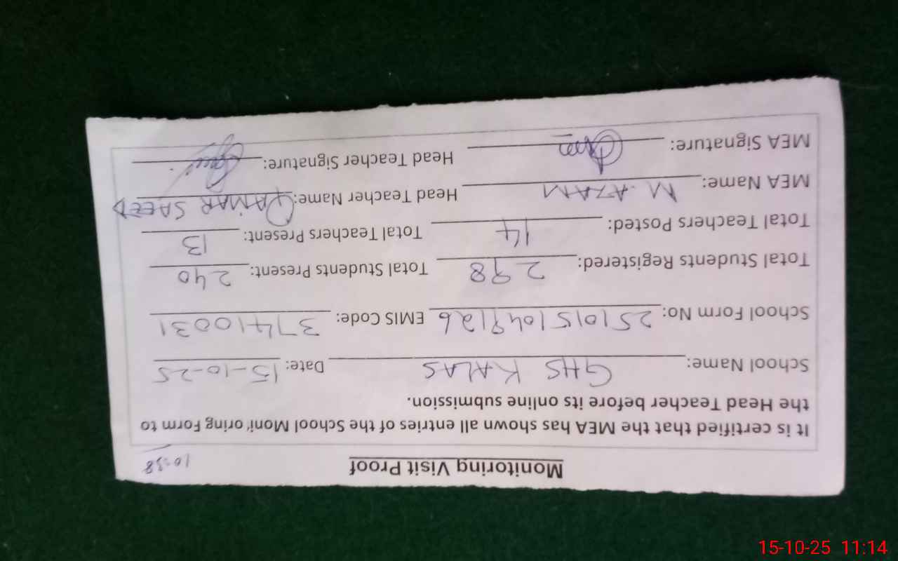 | Attendance Register | Head Teacher | MEA with School | Visit Proof |