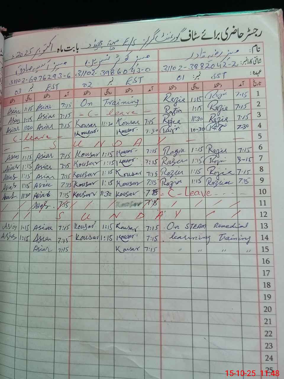 | CNIC | Full Name | Designation | R/C | Absence During Last Calender Month |