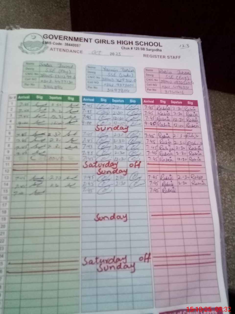 | CNIC | Full Name | Designation | R/C | Absence during last cal. month |