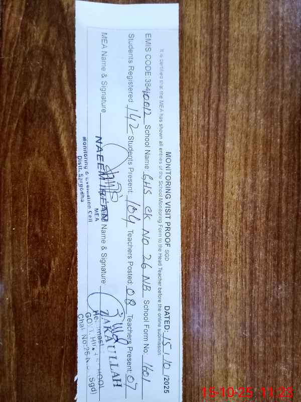 | EMIS Code: 38410012 | Name of School: GHS CHAK NO.26 NB | |||