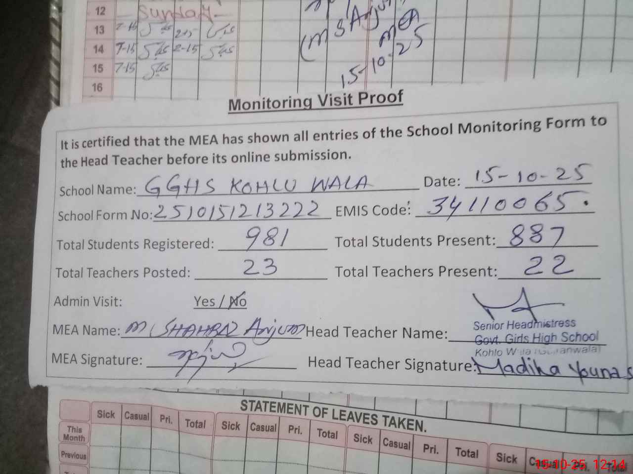| Attendance Register | Head Teacher | MEA with School | Visit Proof |