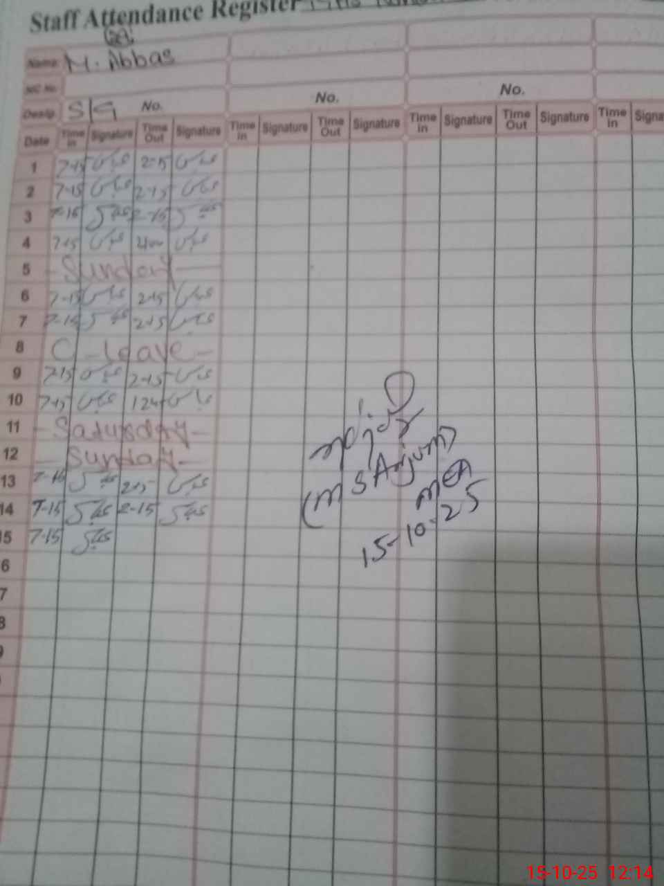 | CNIC | Full Name | Designation | R/C | Absence During Last Calender Month |