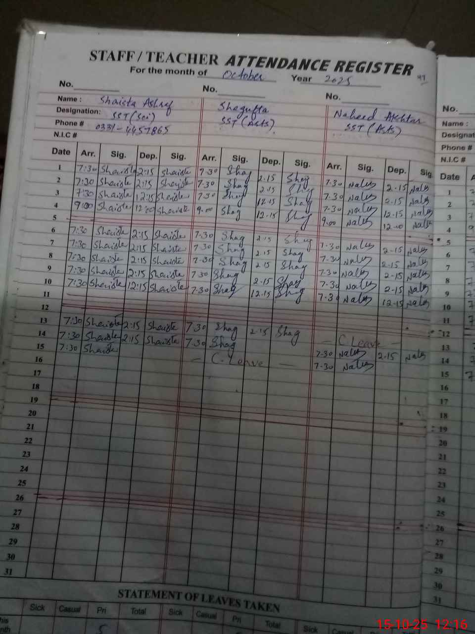 | CNIC | Full Name | Designation | R/C | Absence During Last Calender Month |
