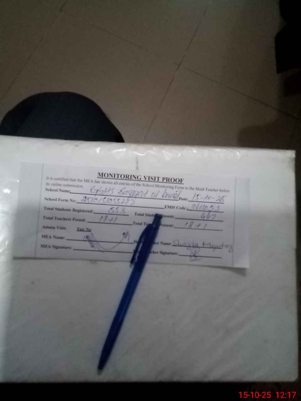 | Attendance Register | Head Teacher | MEA with School | Visit Proof |