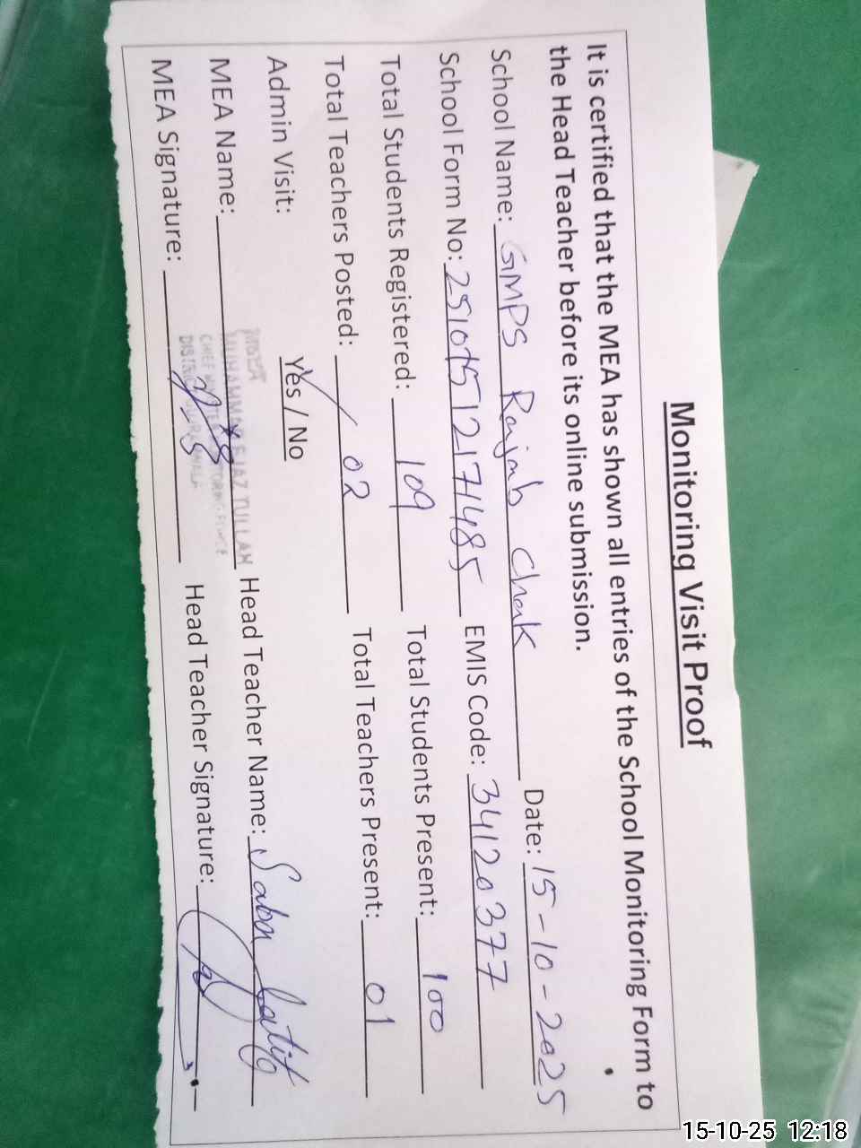 | Attendance Register | Head Teacher | MEA with School | Visit Proof |