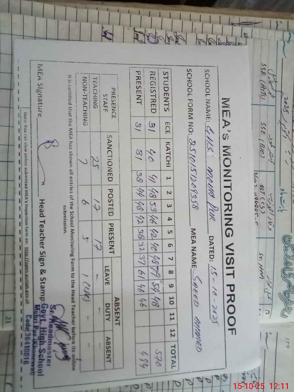 | Certified that this School was Inspected by the Undersigned MEA/DMO Today and the Information Stated Above is as Per Record. | |||||
