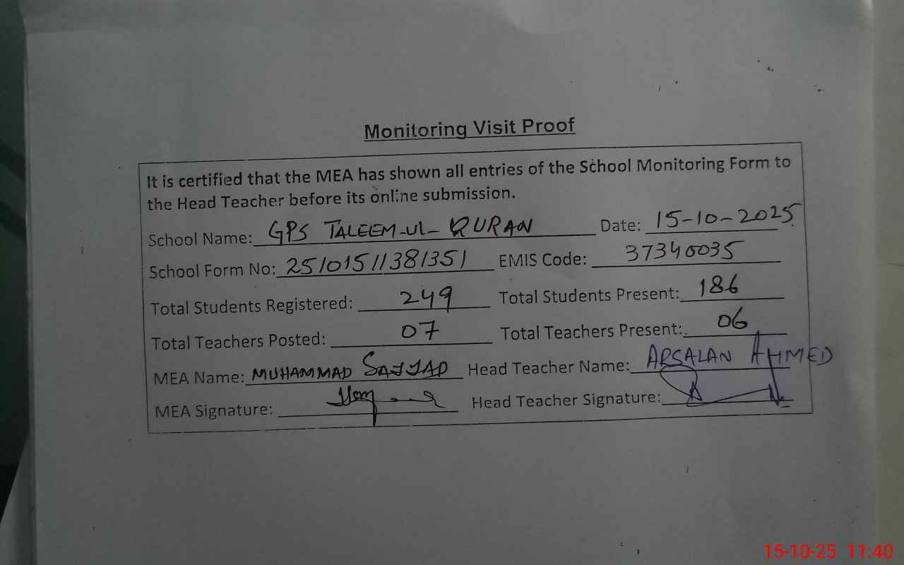 | EMIS Code: 37340035 | Name of School: GPS TALEEM-UL-QURAN | |||