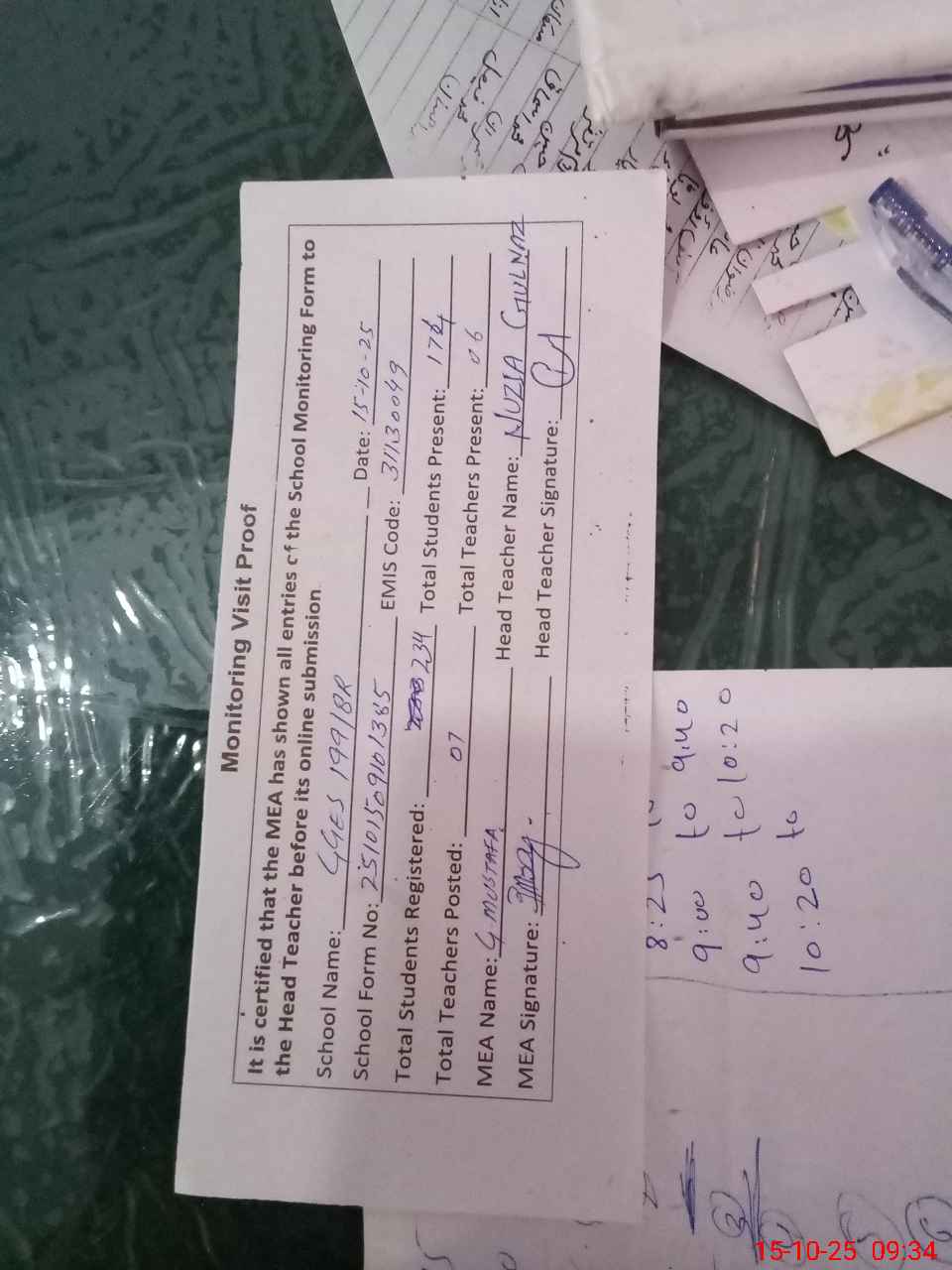 | Attendance Register | Head Teacher | MEA with School | Visit Proof |