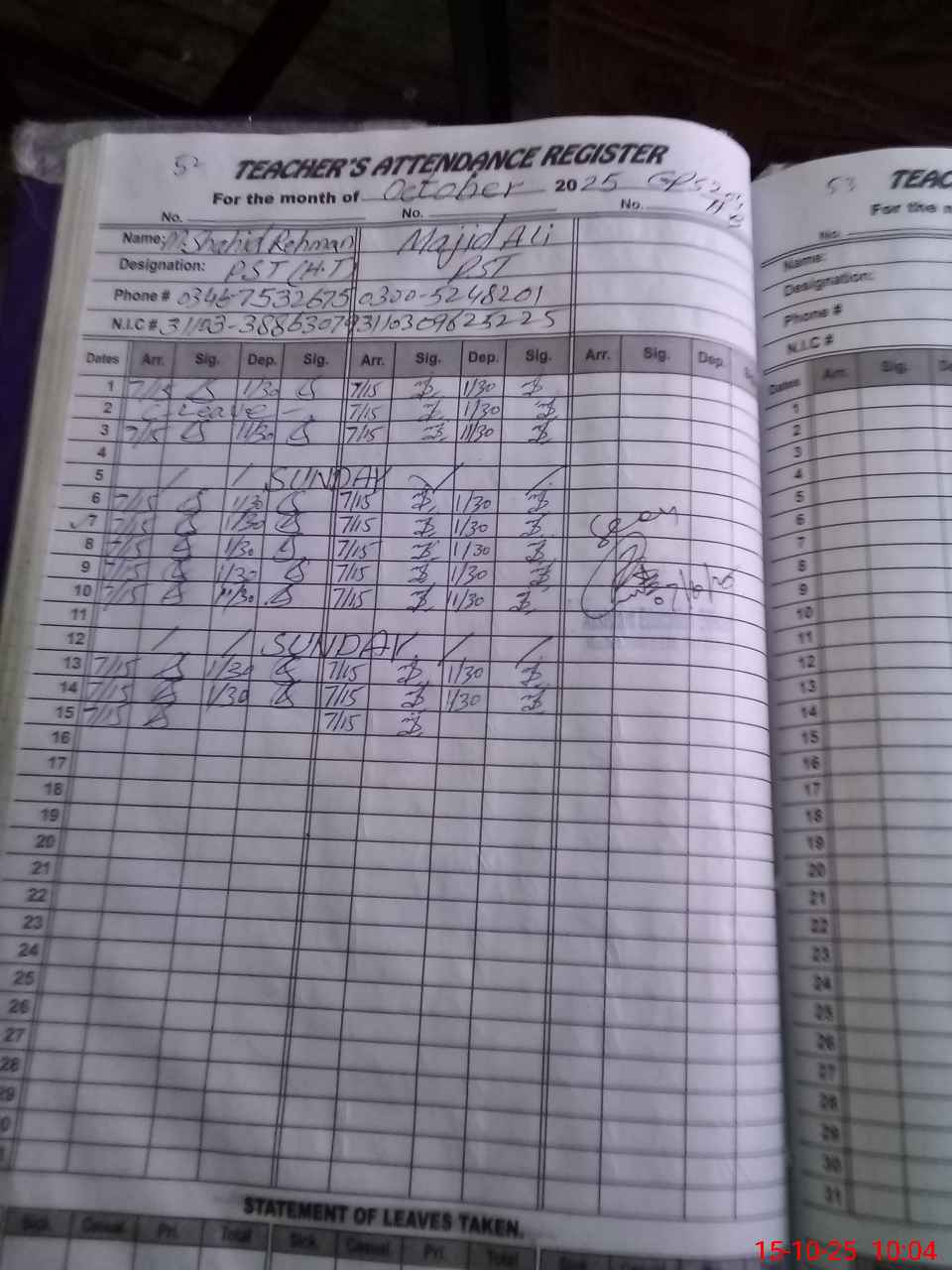 | CNIC | Full Name | Designation | R/C | Absence During Last Calender Month |