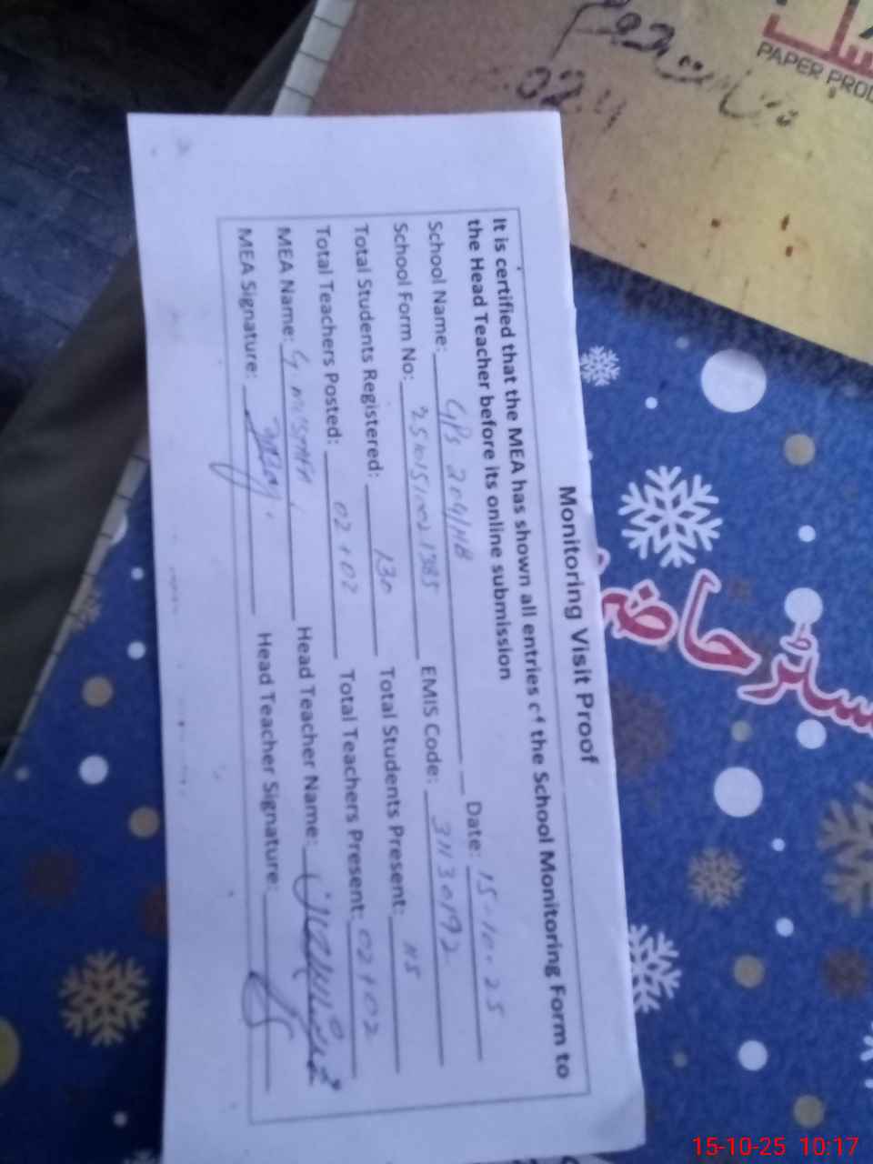 | Attendance Register | Head Teacher | MEA with School | Visit Proof |