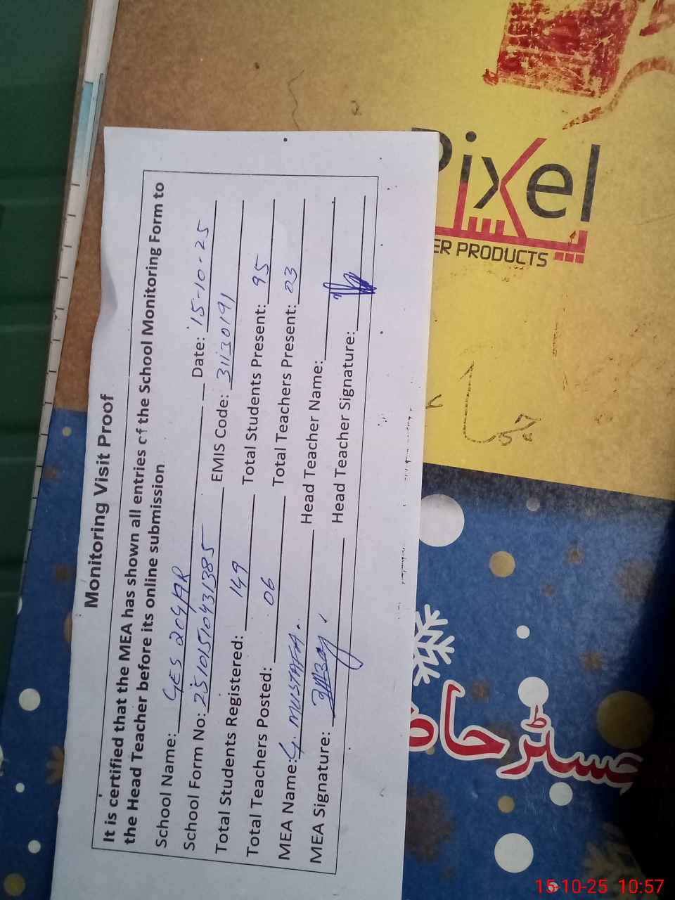 | Attendance Register | Head Teacher | MEA with School | Visit Proof |