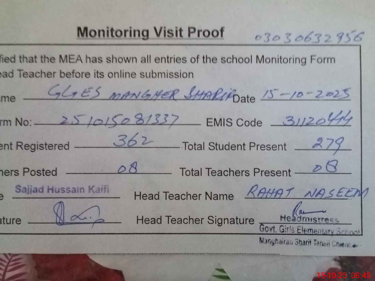 | EMIS Code: 31120444 | Name of School: GGES MANGHAIR SHARIF | |||