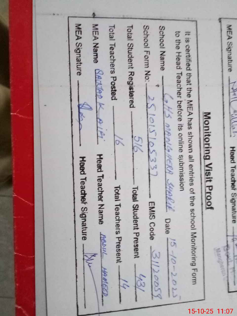 | Attendance Register | Head Teacher | MEA with School | Visit Proof |