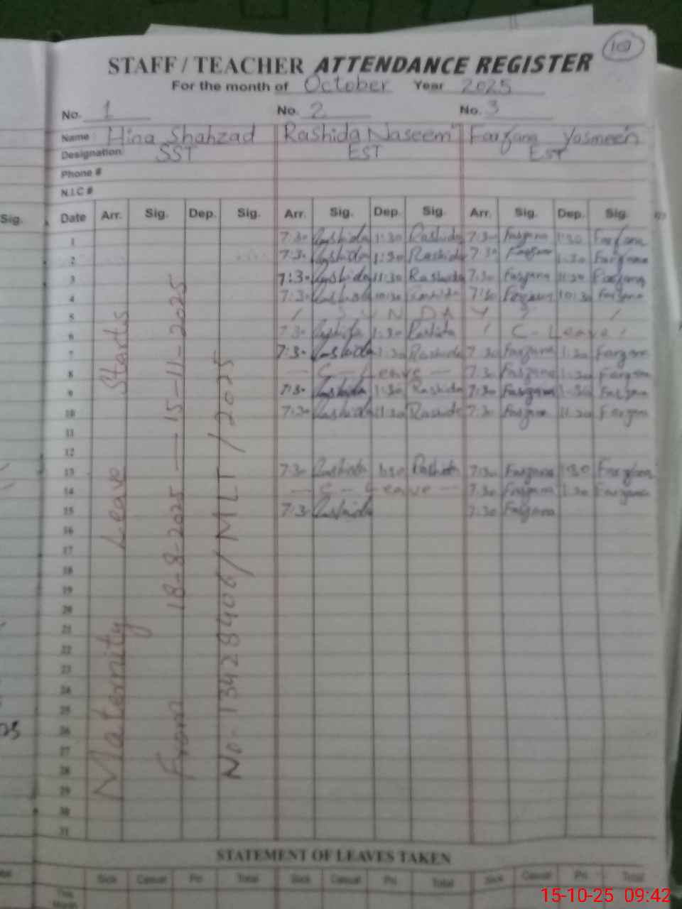 | CNIC | Full Name | Designation | R/C | Absence During Last Calender Month |