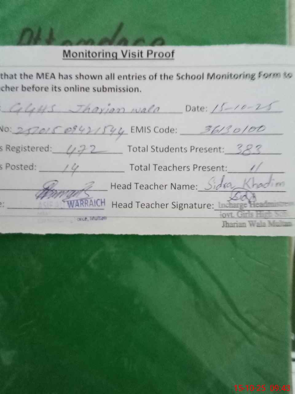 | Attendance Register | Head Teacher | MEA with School | Visit Proof |